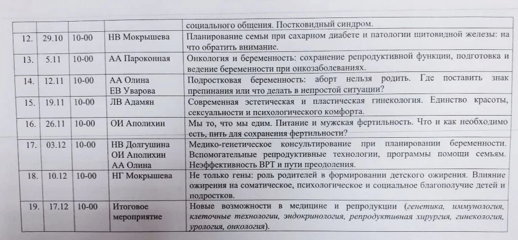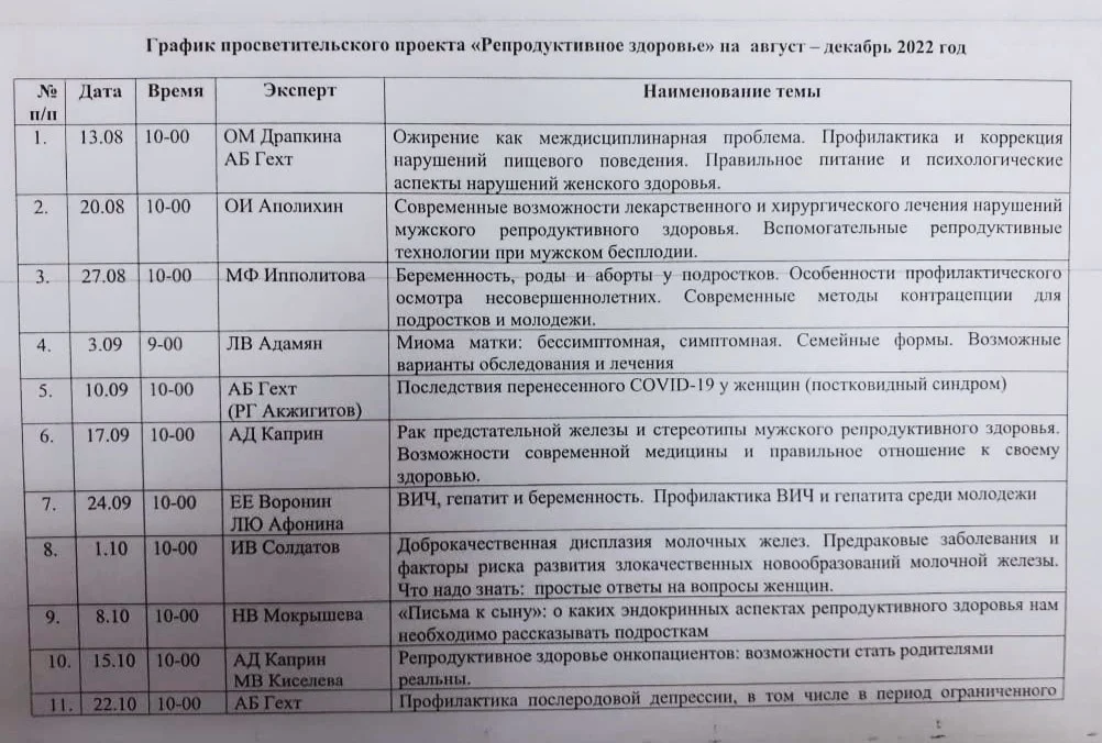 В рамках реализации проекта "Репродуктивное здоровье", утвержденного Заместителем Председателя Правительства РФ Голиковой Т.А. 25.11.2021 №12752п-П12, продолжается проведение регулярных встреч граждан по проблемным вопросам репродуктивного здоровья с федеральными экспертами Совета при Правительстве РФ по вопросам попечительства в социальной сфере.