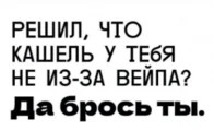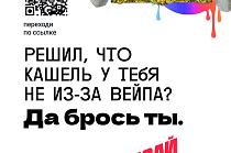 Материалы кампании помогают принять решение оставить зависимость в прошлом. Решил, что кашель не из-за вейпа? Считаешь, что курение электронных сигарет не вредно и это просто «клубничный пар»? Да брось ты!